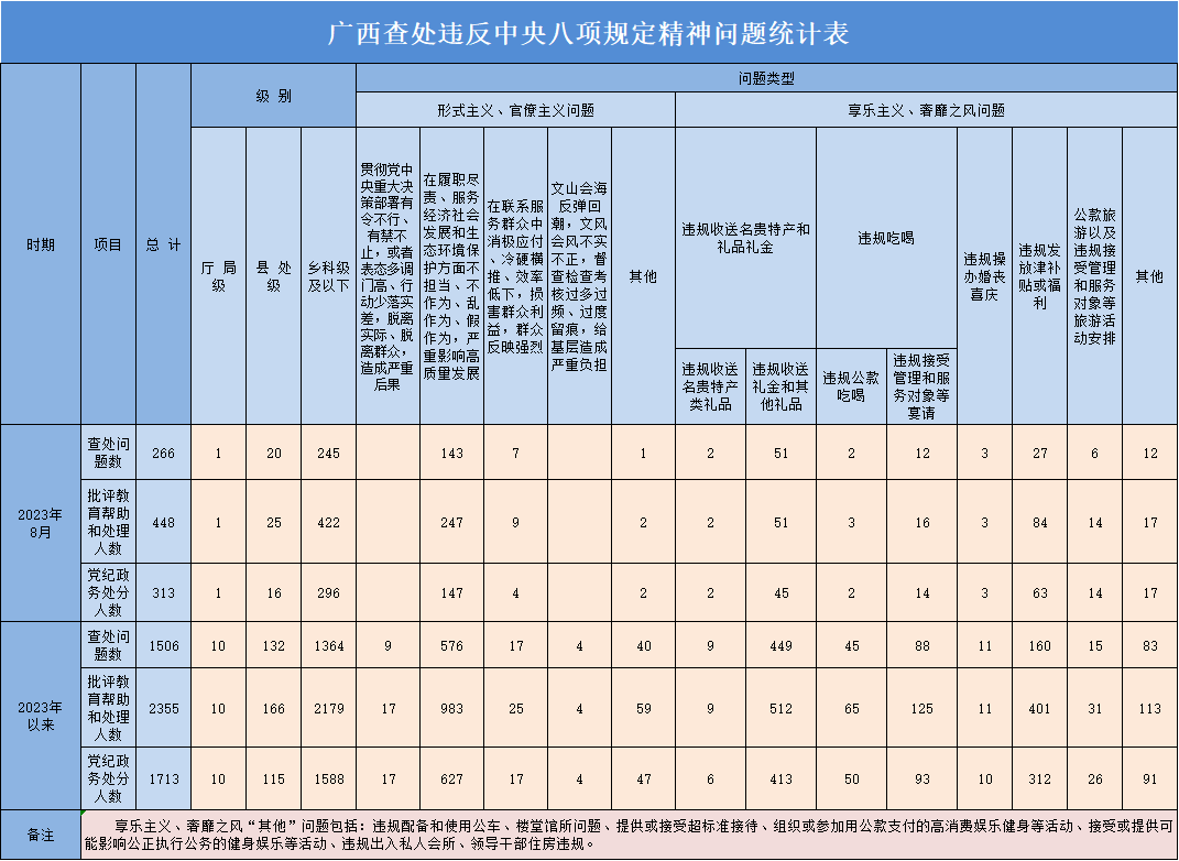 2023年8月广西查处违反中央八项规定精神问题266起
