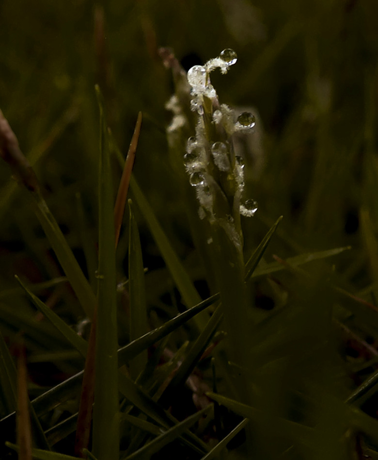 晚秋时刻,草尖上的露珠开始凝结成霜,预示着冬之将临。